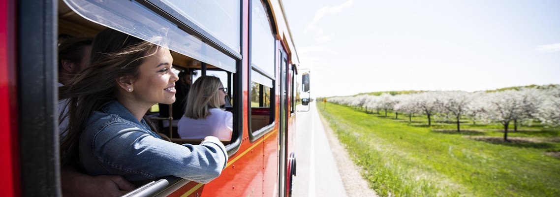 A woman leans out of a trolley window to admire the cherry blossoms.