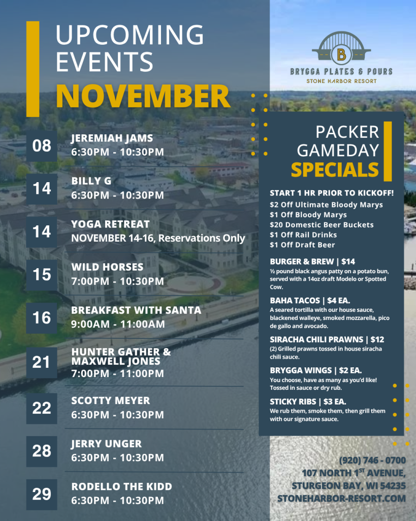 Treat yourself to a taste of the islands at Brygga Plates & Pours! Nestled beside the Steel Bridge, our waterfront location is like no other! Visit the Restaurant for a brand-new breakfast menu featuring southern eggs benedict with house smoked pulled pork. Have a waterfront lunch or dinner; you’ll love the ‘wrapala’ with beer battered walleye, sweet cabbage and guacamole in a grilled tomato tortilla. Come for smoked whitefish dip, walleye fingers or tasty bourbon planked salmon! Papa Louie’s Tiki Bar is open for the season with specialty summer cocktails & live music every weekend. Planning a family gathering? Our Sales Manager is ready to help you arrange the perfect reunion, wedding, or family vacation. Brygga Plates & Pours – where every bite is a taste of paradise, every moment is filled with laughter and every sip is pure bliss.Hours/Availability