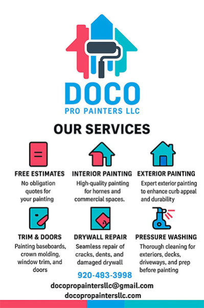 DoCo Pro Painters LLC is Door County’s trusted painting company with over 15 years of experience. We specialize in high-quality interior and exterior painting for homes and businesses. Our services also include wood staining, pressure washing, and drywall patching. Proudly serving homeowners and businesses across Door County and neighboring areas up to 30 miles south, we’re committed to enhancing your property’s appearance with expert craftsmanship and attention to detail. Choose DoCo Pro Painters LLC for reliable, professional painting services."Winter Hours