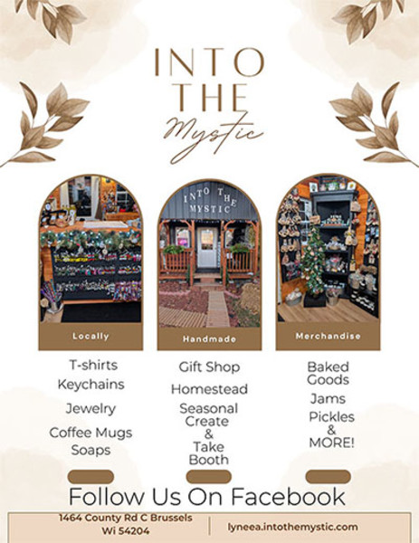 Looking for a unique Gift, Door County T-shirt, Keepsake, or Souvenir? We have have them! Into The Mystic is a locally owned Gift Shop/ Homestead & more located in Brussels. Where each item is hand crafted with a ton of love!Winter Hours