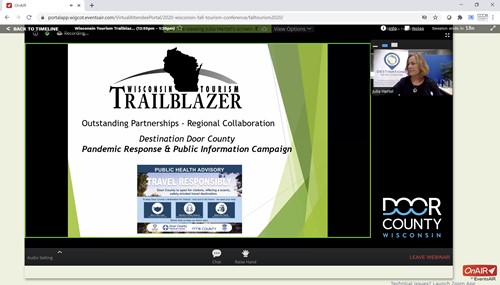Below: Destinations Wisconsin Executive Director Julia Hertel announces Destination Door County as the winner of a Wisconsin Tourism Trailblazer award during the organization's virtual annual fall tourism conference on November 5, 2020.