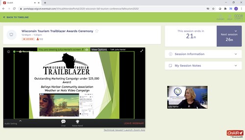 Below: Destinations Wisconsin Executive Director Julia Hertel announces the Baileys Harbor Community Association as the winner of a Wisconsin Tourism Trailblazer award during the organization's virtual annual fall tourism conference on November 5, 2020.