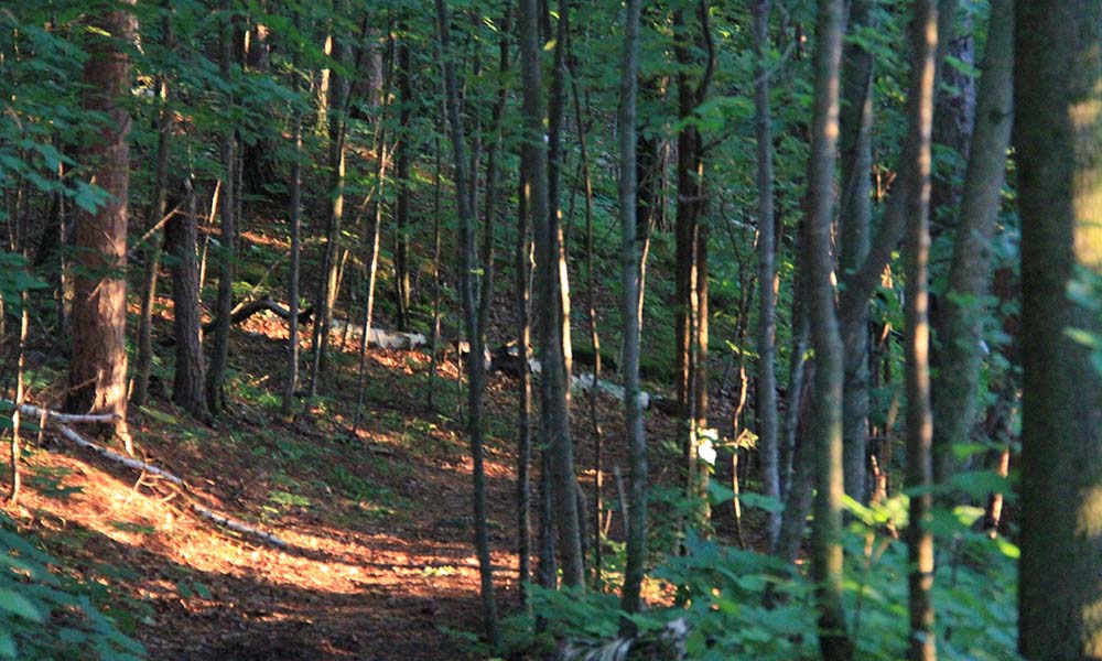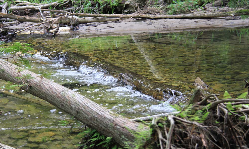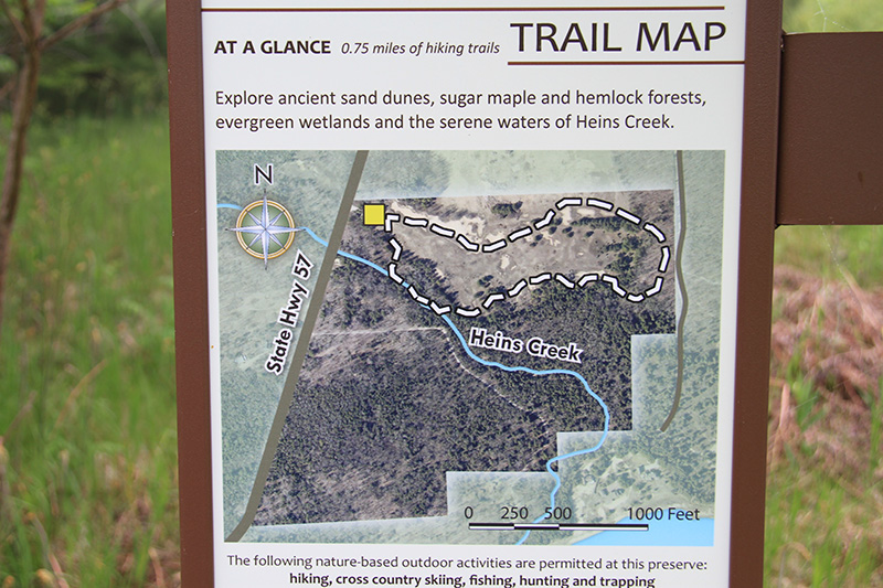 Hiking here you will find forested and open dunes, hemlock and yellow birch, grasses, sedges and a rich understory of flowering plants. The stream and plant life provide an essential wildlife corridor for migratory birds to rest and nest. In spring and summer trout and salmon spawn in Heins Creek. Look for the flash from their silver scales in the clear, shallow waters.