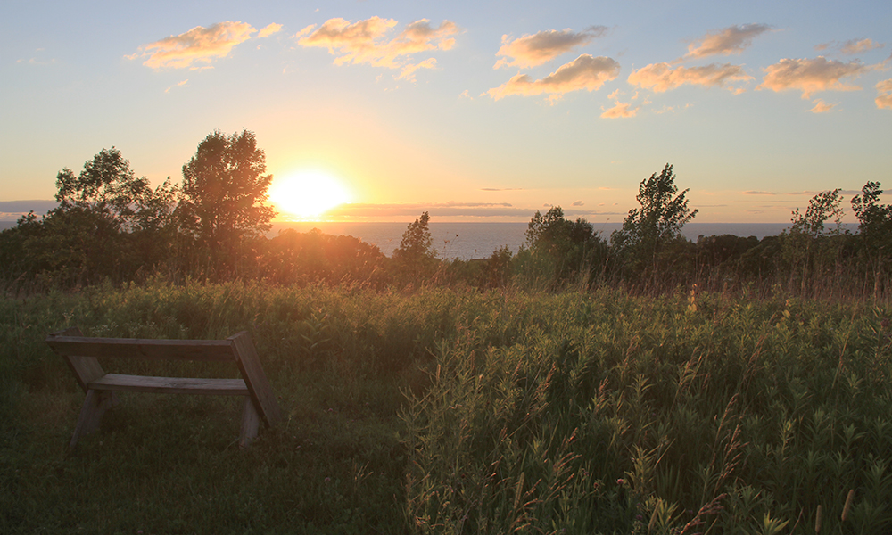 You can access the bluff by hiking through the fields from the entrance on Bay Shore Drive and up the steep face of the escarpment, or, by hiking from the entrance on Reynolds Road where you’ll hike through a forest to get to the bluff edge.