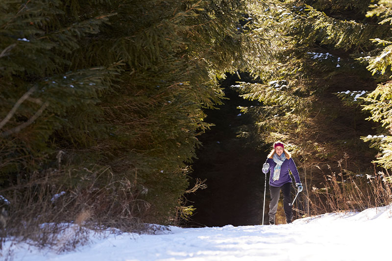 Another favorite wintertime activity in Door County is hitting the trails of the cross-country ski areas. Glide through snowy wonderlands at Newport, Whitefish Dunes, Potawatomi, and Peninsula State Parks, each offering beautifully groomed trails to explore. For an extra magical experience for this cold-weather sport, check their websites for special candlelight skiing events — where the trails are lit by flickering lanterns, creating a truly unforgettable evening under the stars.