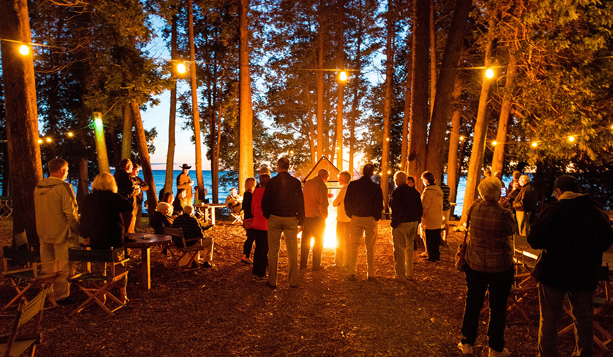 After you park your vehicle, you’ll take a short walk, which leads you further down the sloping peninsula toward the lake, where there's a forest full of green cedar trees. Follow the walking paths to discover lush gardens—called the “Far Gardens”—and, closer to the lakefront, a Beer Garden complete with a bonfire pit that is lit at intermission.