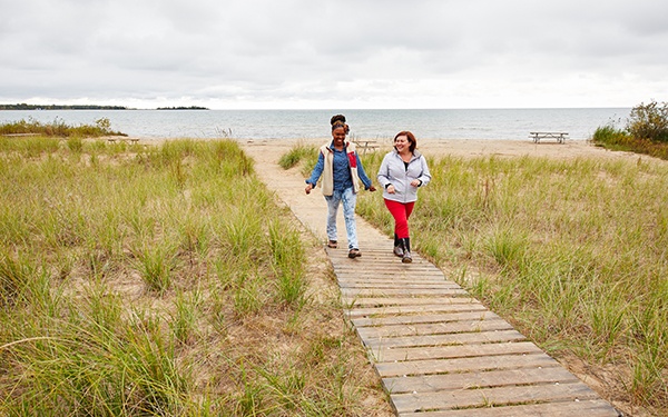 One of the most breathtaking views of Lake Michigan you can get in the county, plus a wooden observation deck, 100-foot limestone bluffs, hiking, picnics, and bird watching